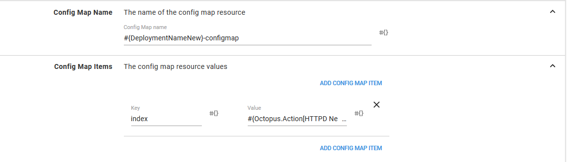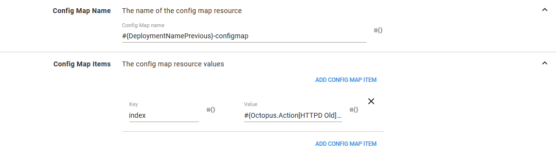 The name of the ConfigMap is set to #{DeploymentNamePrevious}-configmap, and we add a single item called index with the value #{Octopus.Action[HTTPD Old].Package[httpd].PackageVersion}.