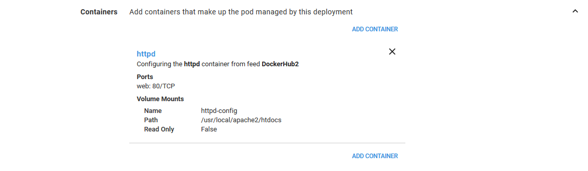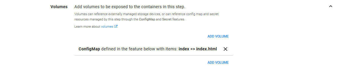 Otherwise, the configuration of the containers, volumes, and deployment strategies is the same as the previous step.