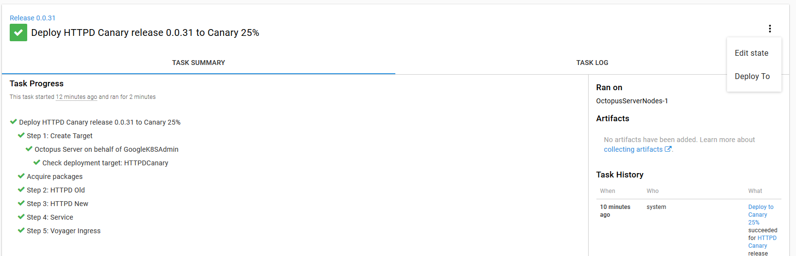 Octopus will then rerun the deployment, which in turn will restore the canary deployment to a state where 25% of traffic is directed to the new version.
