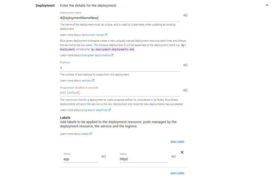 This is why we set the Octopus.Action.KubernetesContainers.ConfigMapNameTemplate variable to #{Octopus.Action.KubernetesContainers.ConfigMapName}-httpdcanary. This overrides the default behavior of appending the deployment ID, and instead appends the fixed string httpdcanary.