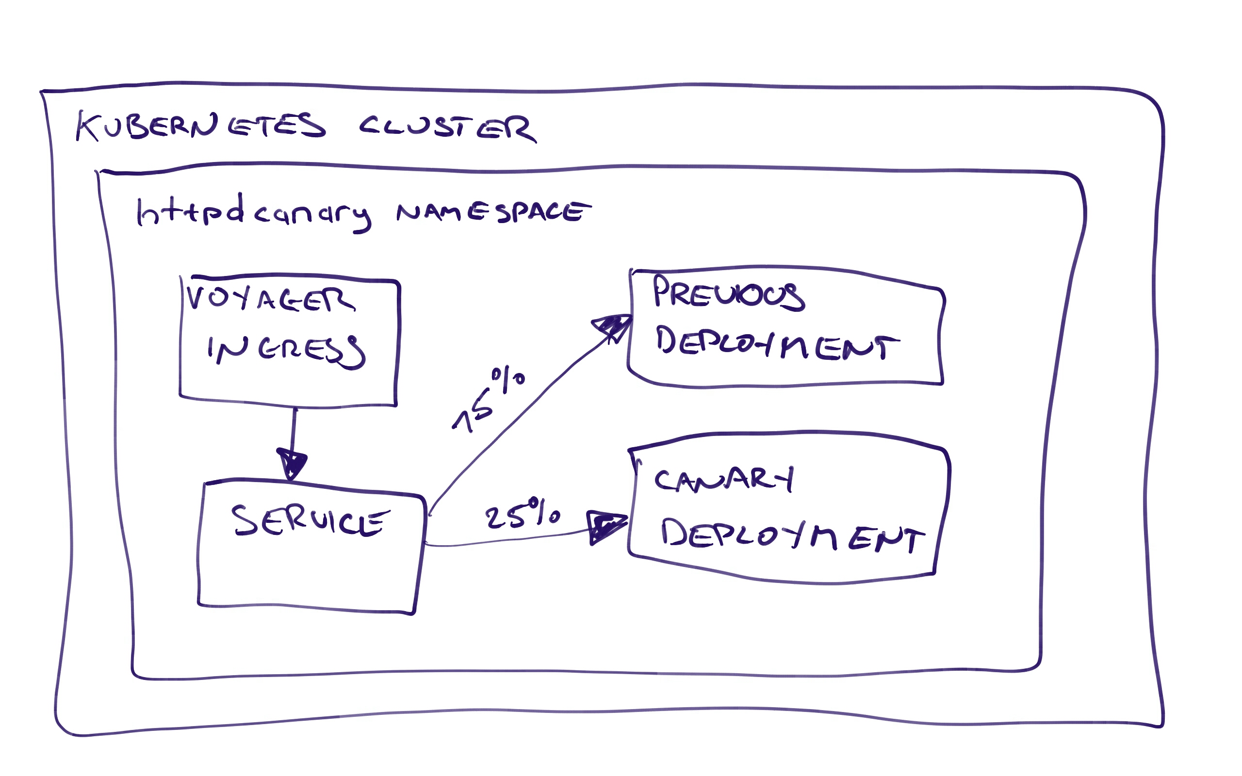 Because of the ingress.appscode.com/backend-weight annotations on the Pod resources, Voyager knows to direct 25% of traffic to the canary Pod resources, and 75% to the previous Pod resources.