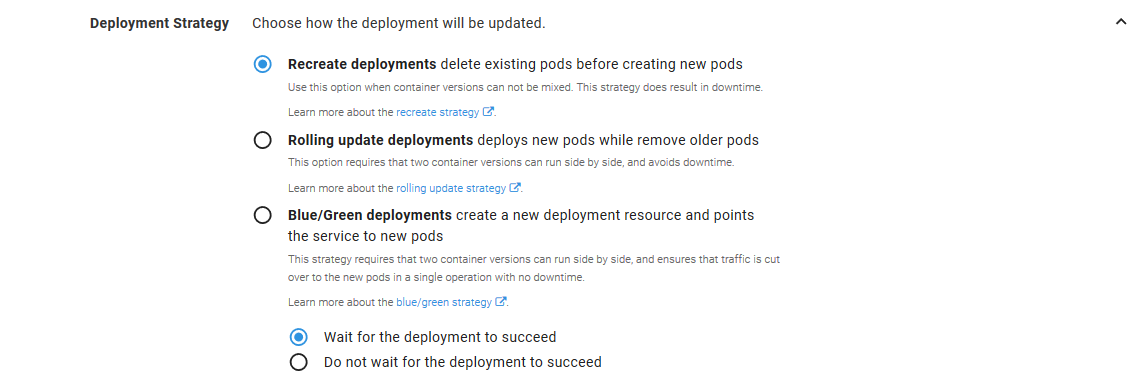 The Deployment strategy section has been left with the default option of Recreate deployments.