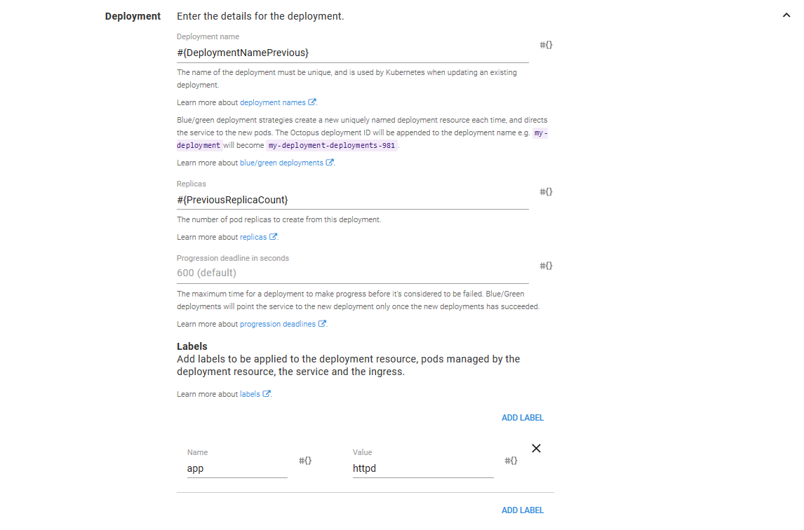 | DeploymentNamePrevious | The name of the previous Deployment resource | httpd-previous |