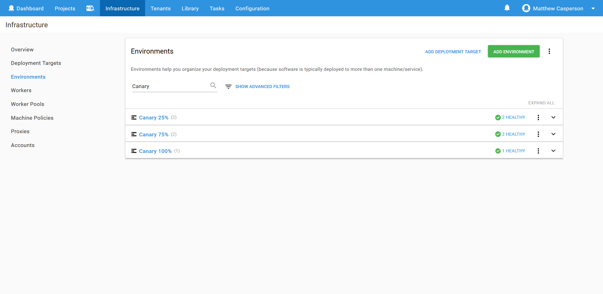 We’ll model the progression of the canary deployments as Octopus environments. Doing so has a number of advantages, such as displaying the current progression on the dashboard, and allowing easy rollbacks to previous states.