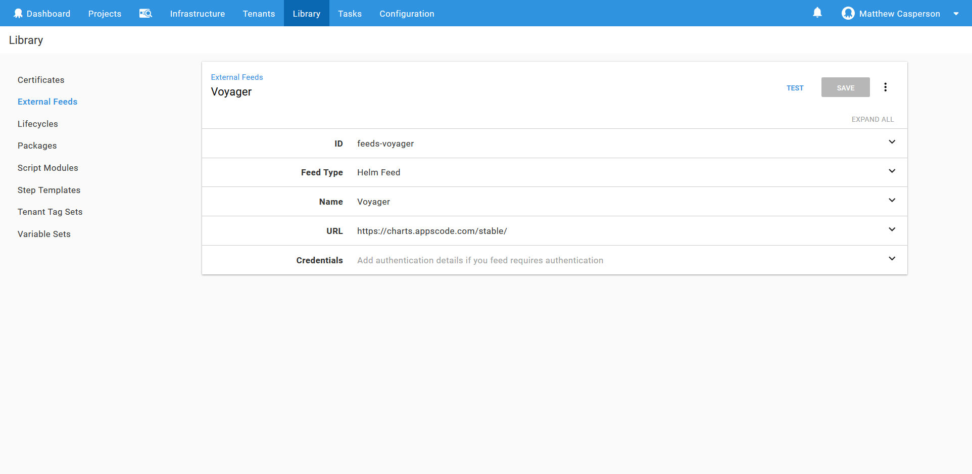The first step is to create an external feed pointing to the AppsCode Charts Repository. External feeds are found under {{Library,External}} Feeds.