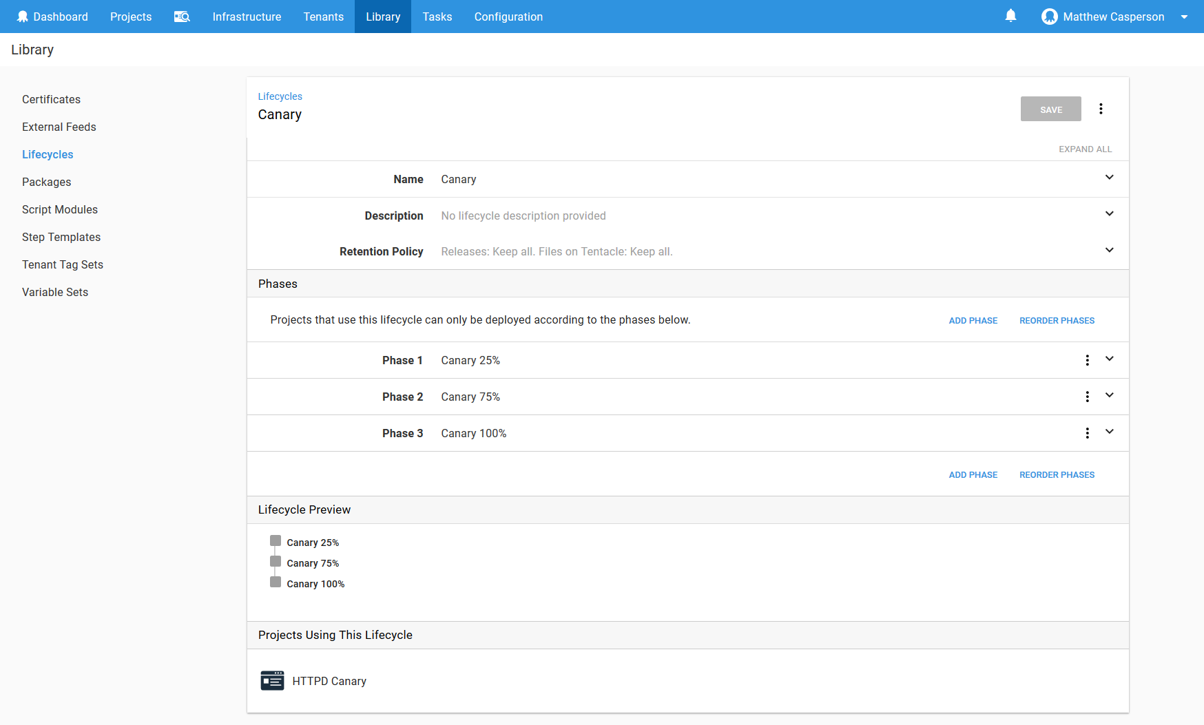 To progress our application through these environments, we’ll create a Lifecycle with three phases, one for each of the canary environments.