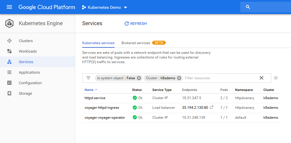 Once deployed, each Voyager Ingress resource creates an associated Load Balancer Service resource. This load balancer has a public IP address which we can access from a browser. In my case, the public IP is 35.194.2.130.