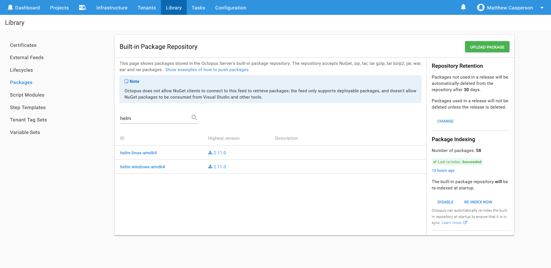 To accommodate this need for exact matches, the Helm step in Octopus allows an executable from a package to be used when deploying the chart.