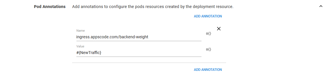 In the Pod Annotations section, we define an annotation called ingress.appscode.com/backend-weight with the value from the variable PreviousTraffic. The PreviousTraffic variable is either 0, 25 or 75 depending on the environment we are deploying to.