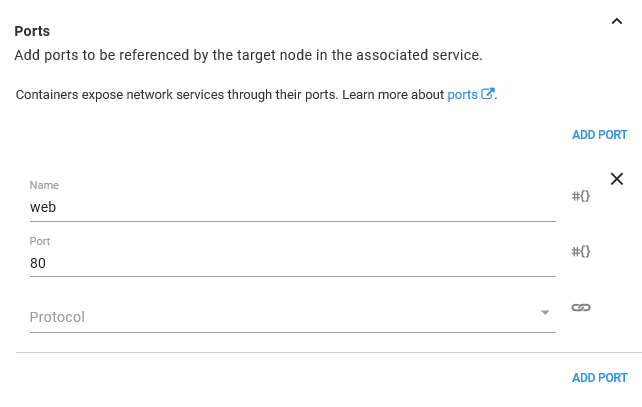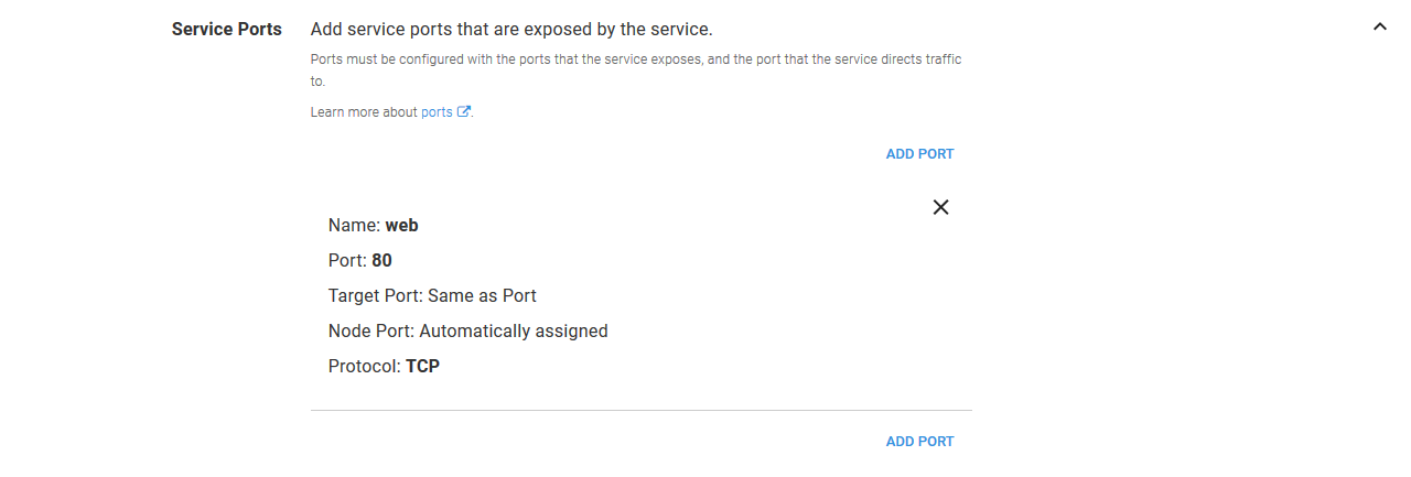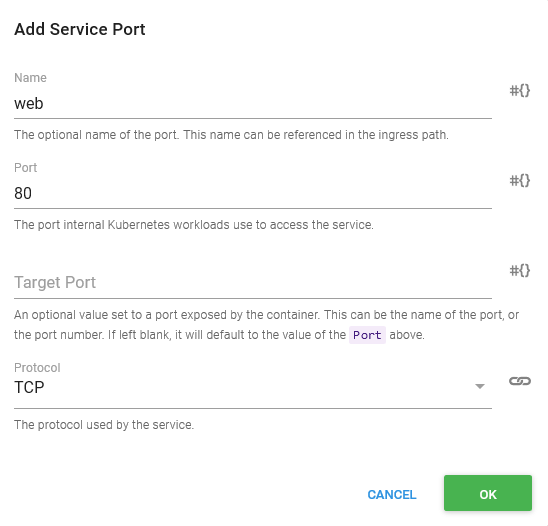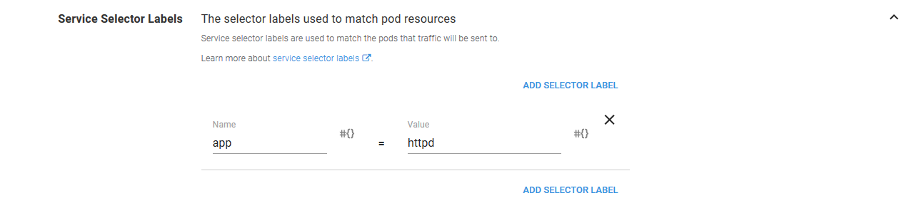The service selects the Pod resources it directs traffic to by setting the Service Selector Labels to a name of app and value of httpd. These are the same labels we defined in the previous container steps.