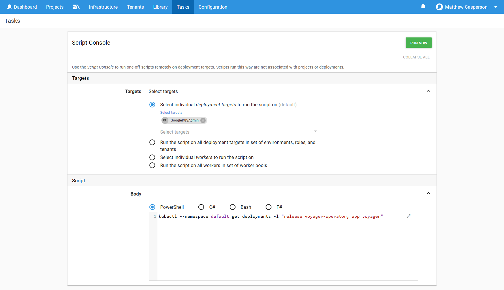 We can run these ad hoc commands through the Octopus Script Console, which can be accessed via {{Task,Script Console}}.