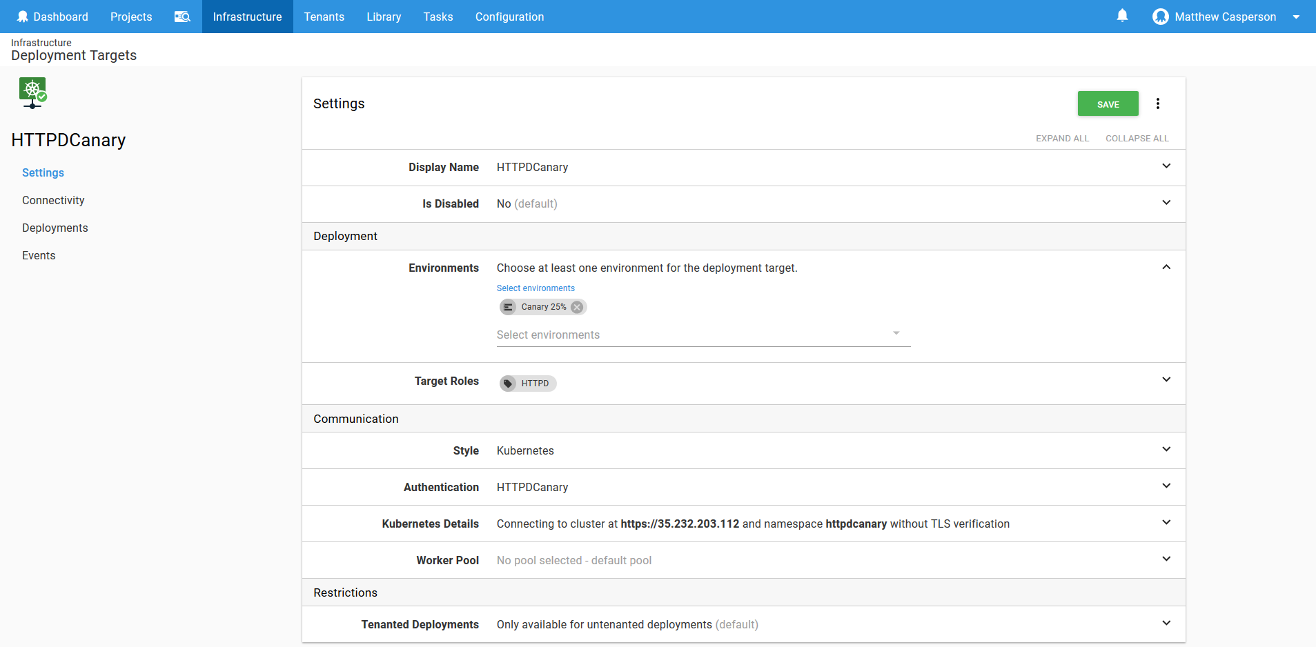 Finally, ensure the Kubernetes administrative target can access the canary environments by adding them to the Environments field.