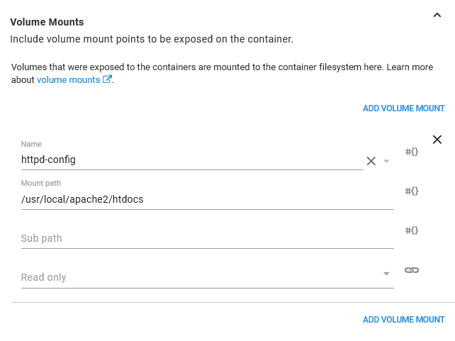 Inside the container, we mount the volume defined earlier to the path /usr/local/apache2/htdocs. That path is where HTTPD looks for content to serve up. And because we exposed the ConfigMap item called index as a file called index.html, we end up with a file called /usr/local/apache2/htdocs/index.html mounted in our container.