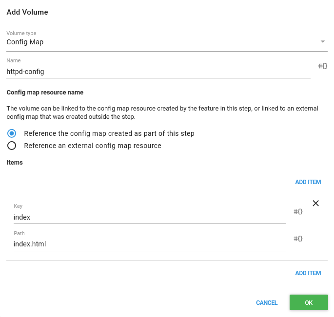 In the Volumes section we need to map an item from the ConfigMap we’ll create later on called index to a file called index.html. The ConfigMap will hold some custom content that is exposed to our container as a file called index.html, which in turn will be presented by HTTPD.