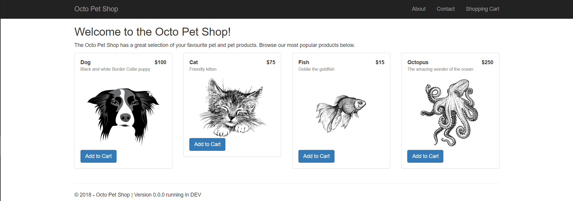 After the YAML has successfully run, the OctoPetShop application should be running. Navigate to http://localhost:5000.