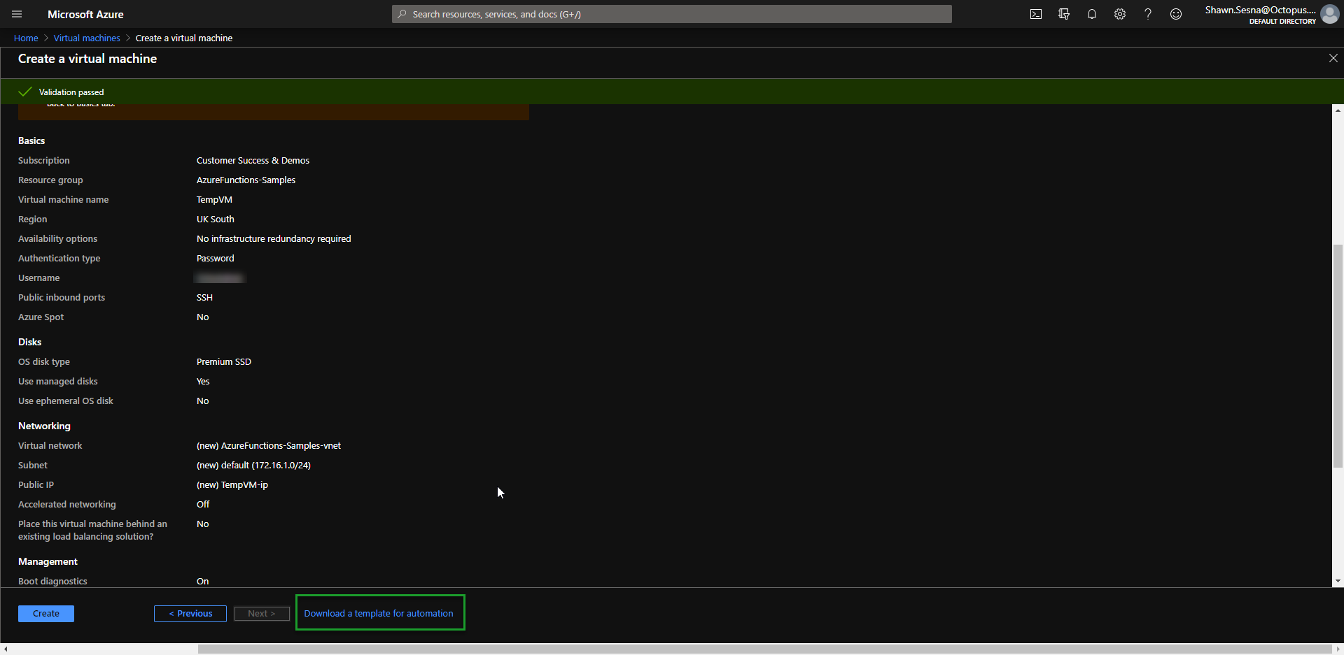 The specific selections that you make when generating your ARM template aren’t important as you can parameterize everything and control them with Octopus Deploy variables. In the above image, items like Virtual machine name, Username, and OS disk type will all be parameters in our template to make it more generic. This will make more sense when creating our Runbook.