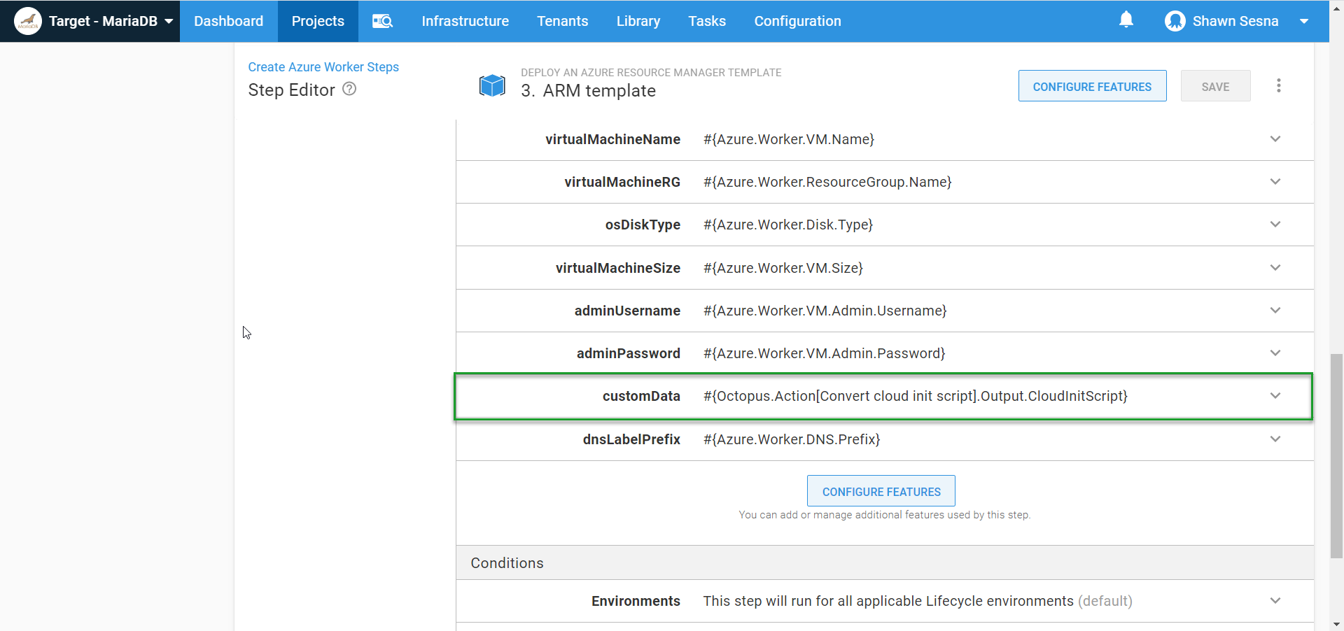 With our script set up, we need to convert it to a Base64 string, then assign it to an output variable so it can be used in the ARM template. Here it is in a Run a Script step called Convert cloud init script:
