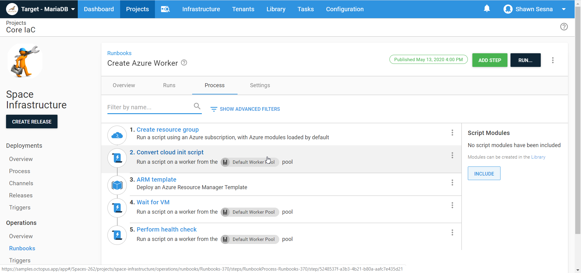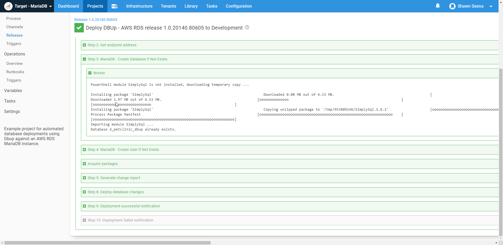 As you can see, the step template detects the SimplySql module is not installed, downloads SimplySql, and imports it. It then connects to the MariaDB server and finds the database already exists, and it does it all with PowerShell.
