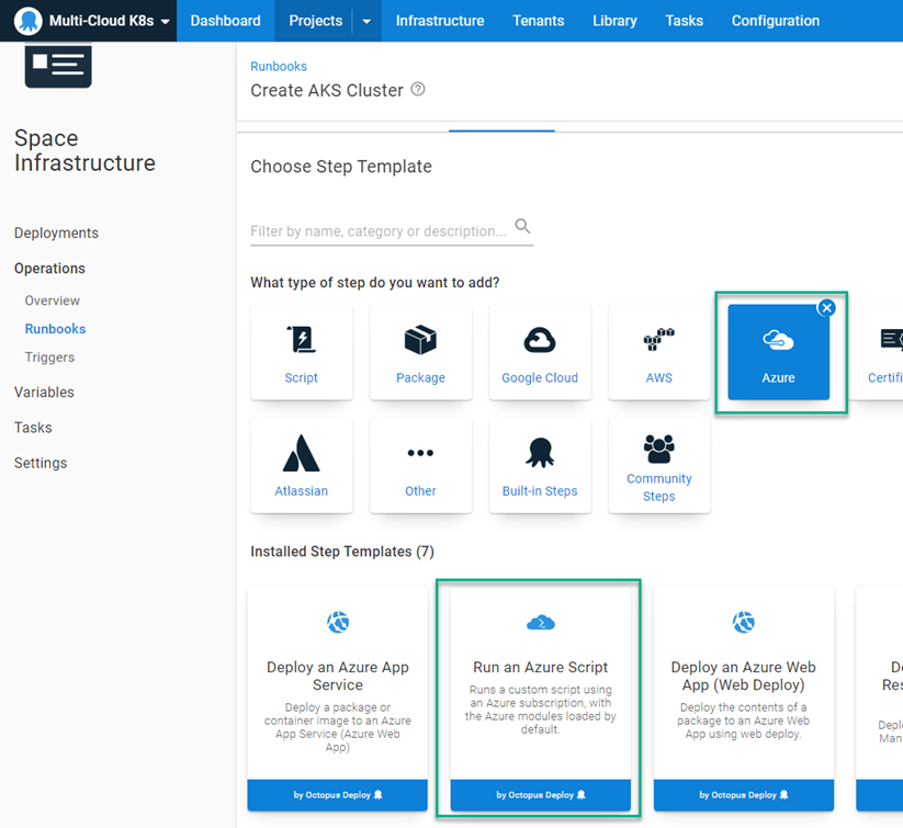 Use the Runbooks feature of Octopus Deploy to create the clusters. In addition, you need to use the Execution Containers for Workers feature, because the Worker tools image contains the CLI for all three platforms as well as kubectl.