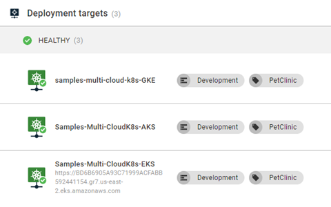 New-OctopusKubernetesTarget -Name "<Display name of target>" -clusterName $clusterName -octopusRoles "Test1" -octopusAccountIdOrName "<Google Account>" -namespace "default" -skipTlsVerification $true -octopusDefaultWorkerPoolIdOrName "Hosted Ubuntu" -healthCheckContainerImageFeedIdOrName "Docker Hub" -healthCheckContainerImage "octopusdeploy/worker-tools:3-ubuntu.18.04" -clusterRegion <Google region> -clusterProject <Google project name>If all three runbooks are executed, you should have 3 Kubernetes clusters.
