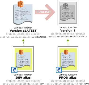 For example, the alias Prod might point to a version of a Lambda created a month ago. Because the published versions are immutable, developers can continue to update the Lambda, but the alias called Prod will always reference a known stable version.