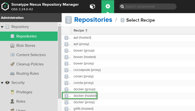 Creating a Docker registry repository in Nexus is pretty easy. Log in to Nexus and navigate to the Server Administration tab (gear icon):