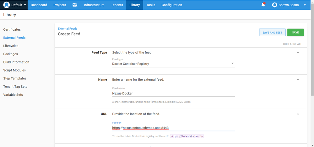 To create an external feed in Octopus Deploy click on the Library tab, then External Feeds, and click the ADD FEED button.