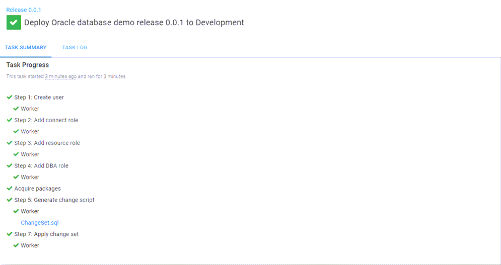 As you can see, the Report Only step attached the ChangeSet.sql file as an artifact, which can be reviewed prior to approval. Expanding the Apply changeset step shows: