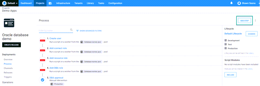 To add the Liquibase template, click the ADD STEP button in the Process tab of your Octopus project:
