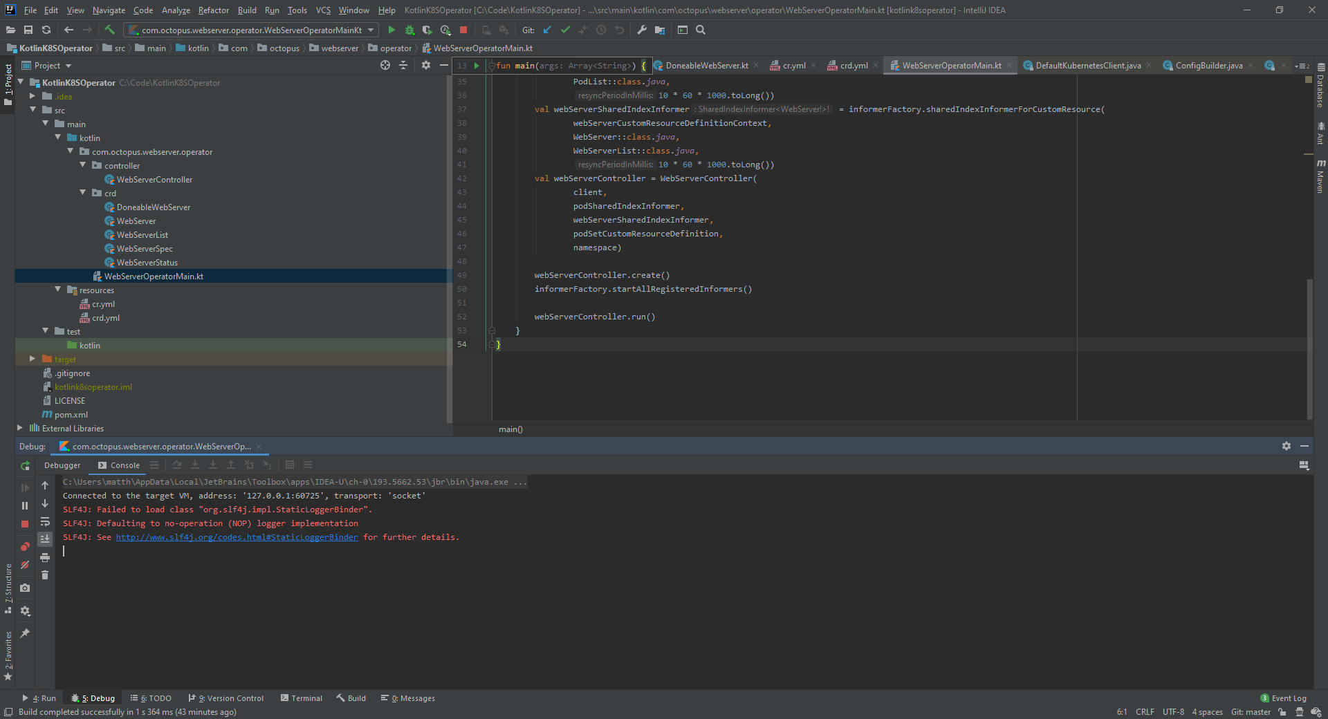 To understand the operator pattern, let’s look at a simple example written in Kotlin. The code for this operator is available from GitHub, and it is based on the code from this RedHat blog. The operator will extend the Kubernetes cluster with the concept of a web server with a WebServer CRD and a controller that builds pods with an image known to expose a sample web server.