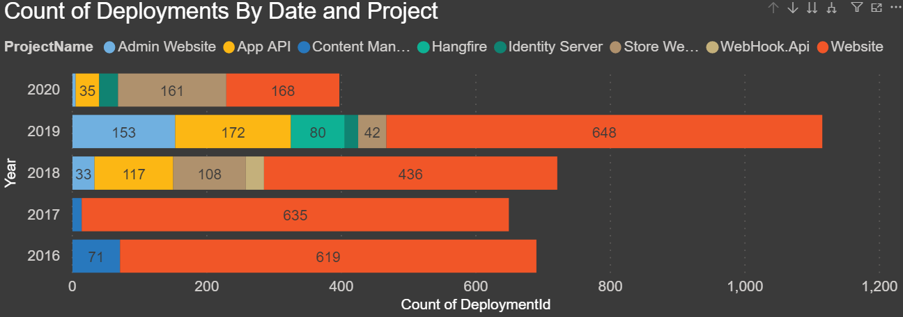 Count of Deployments By Date and Project: This is the first chart I put together, and I was shocked to see how many deployments we’ve done each year over the last five years. This report breaks down each year and stacks the projects. In this chart, you can drill down to see the count of deployments by quarters, month, and day. You drill down by clicking the double down arrow and then click on the up arrow to go back: