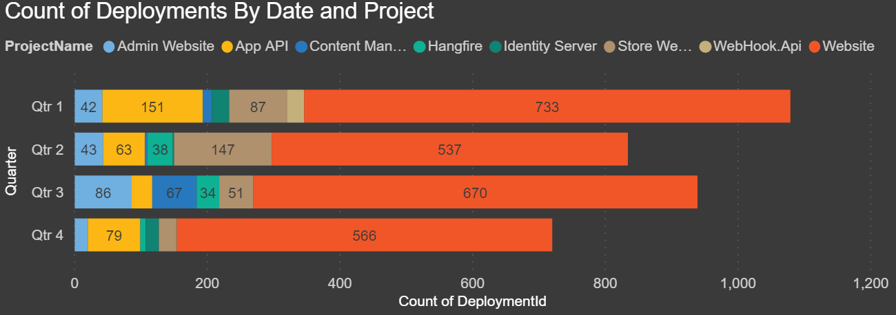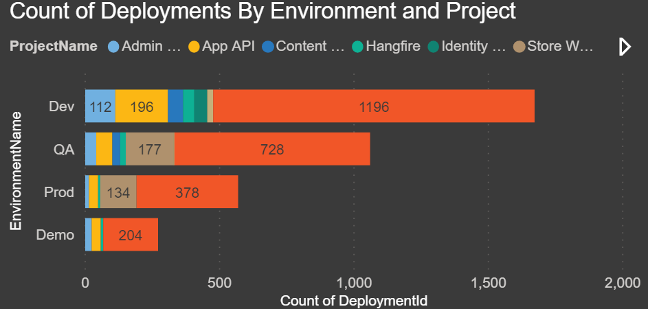 Count of Deployments By Environment and Project: The chart below shows how many deployments we have done in each environment split by project: