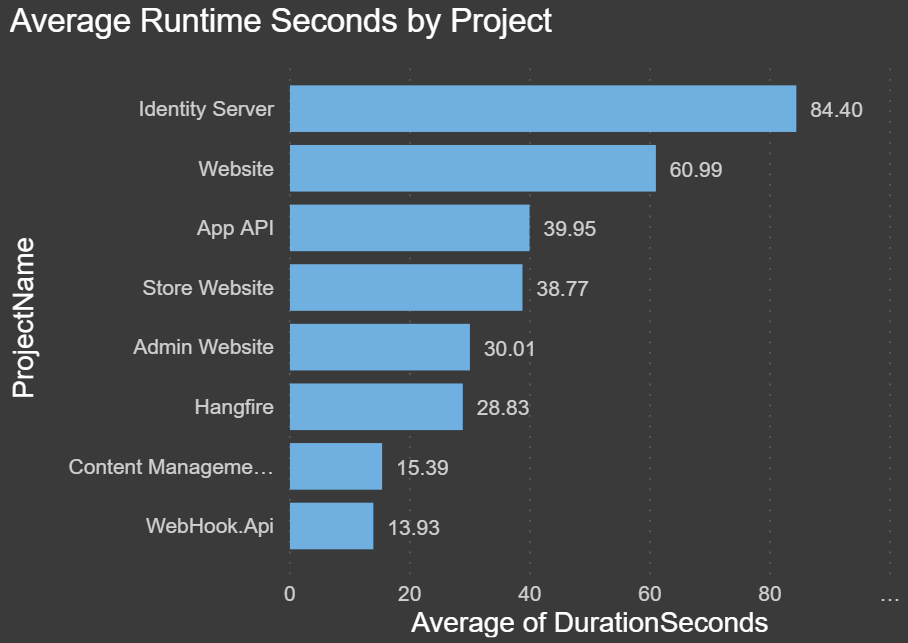 Average Runtime Seconds by Project: The chart below shows how long each deployment takes for each project on average. This is for all environments: