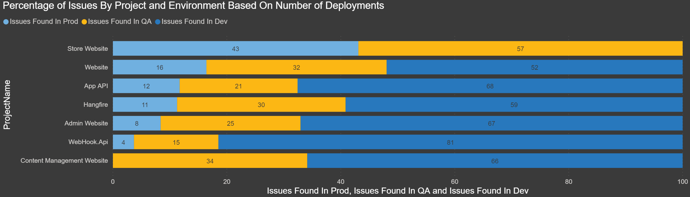 If you notice in this chart that the Store Website in both QA and Prod almost have the same percentage of deployments. To me, this means that instead of testing and finding issues in QA, the bugs are found in Production. I think this means there’s a code quality issue that needs to be addressed.