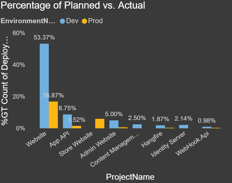 Percentage of Planned vs. Actual: The chart below compares the releases from Development and Production. The goal was to see how many project releases were meant to go to Production, but due to either code issues or bugs they had to be re-released before making it to Production: