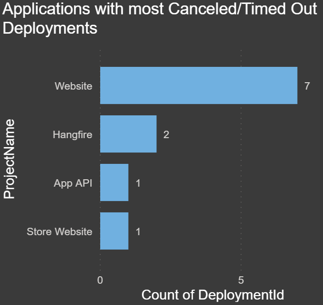 Applications with the most Canceled/Timed Out Deployments: The chart below shows which project has had the most canceled or timed out deployments. This could be an indication of a script or process taking too long if it timed out. This might be a large database change script or perhaps large file transfers: