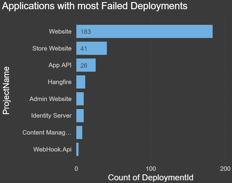 Applications with the most Failed Deployments: The chart below shows which project/application has had the most failed deployments. This could be for any number of reasons, such as misconfigured variables, changed servers, third-party component changes or upgrades, servers being down, failed scripts, etc. If there is a high number, this may be something to look into: