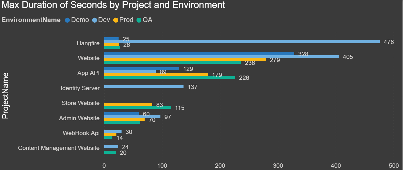 Max Duration of Seconds by Project and Environment: The chart below shows the max duration in seconds for each environment for each project. This allows you to compare how long it takes to deploy your code for each project: