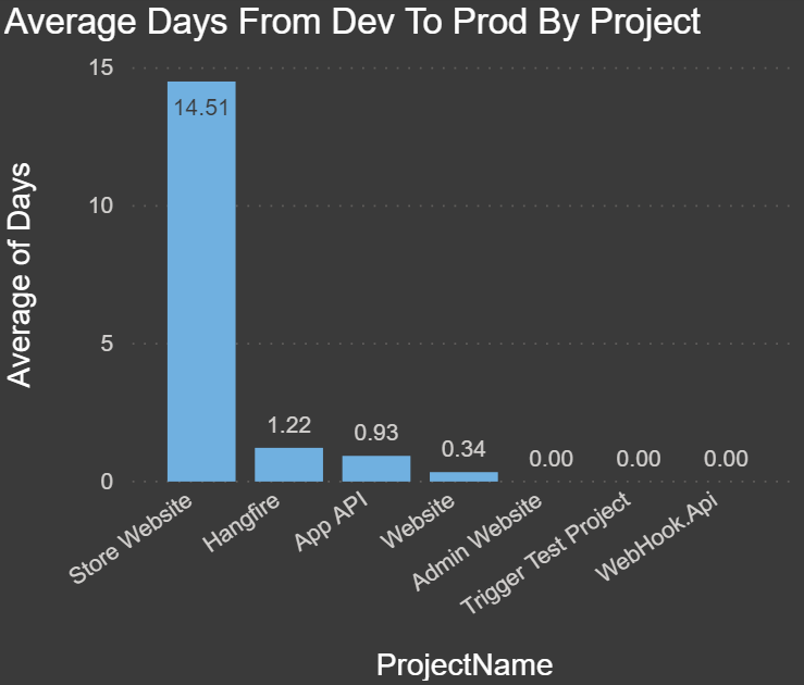 Average Days from Dev to Prod by Project: The chart below shows the average duration in days from the time a release has been deployed to Dev to when it is promoted to Production: