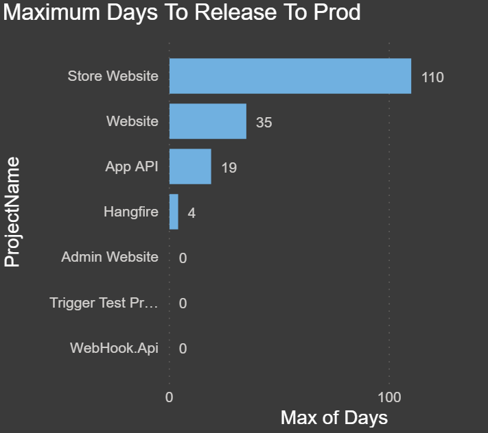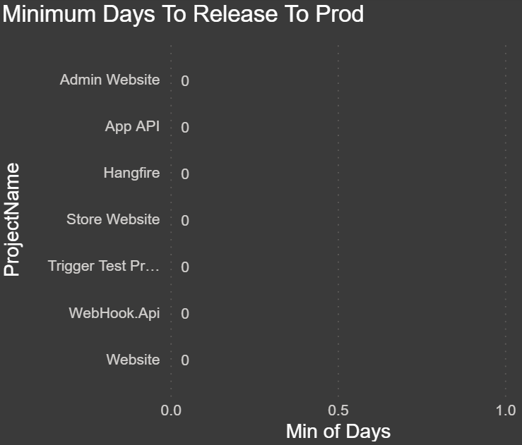 Minimum Days to Release to Prod: The chart below shows the minimum time in days for a release to make it from Dev to Production. In our case, we have deployed releases from Dev to Production on the same day: