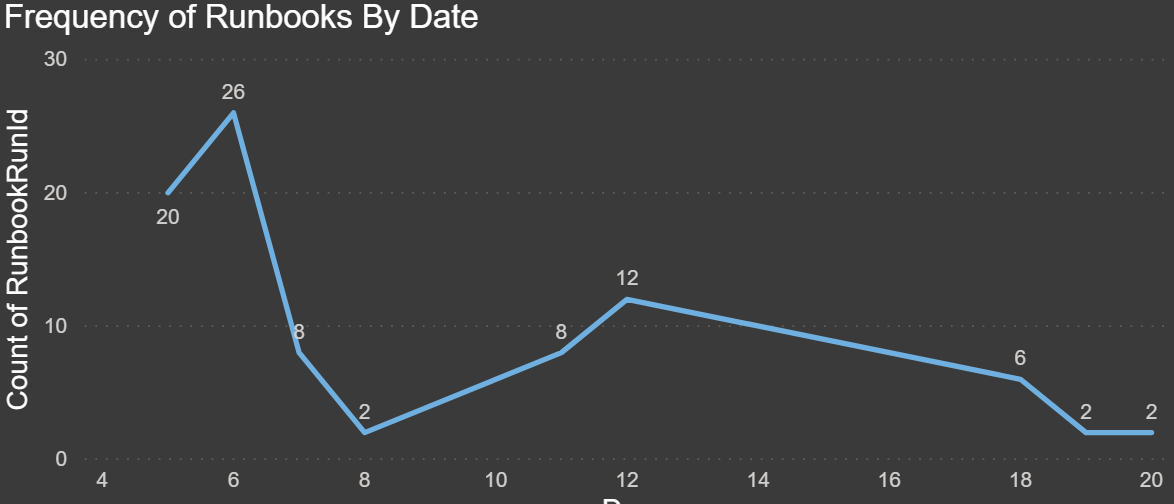 Frequency of Runbooks by Date: The chart below shows the frequency of executions by date. Since we have only recently started using runbooks, I drilled down to the day to see how many we have run this month: