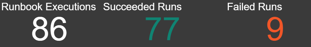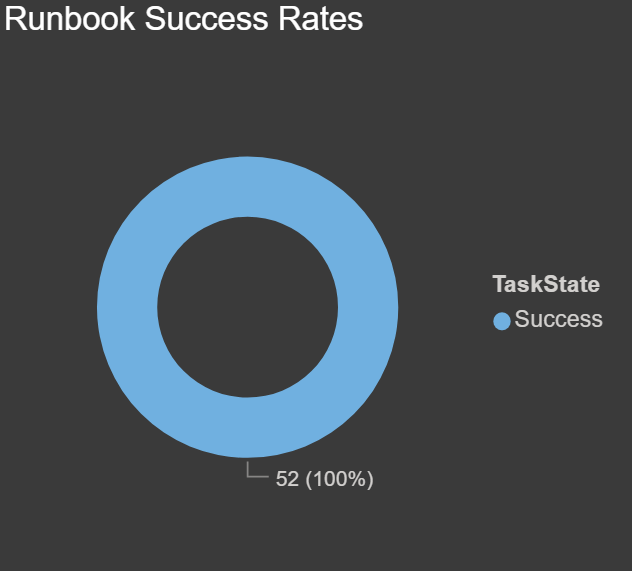 Runbook Success Rates: The chart below shows the count of runbook executions based on their task status, filtered by IsPublished true. We had some failures when we were testing, but we only want to know if these failed after they have been published and used by our end users:
