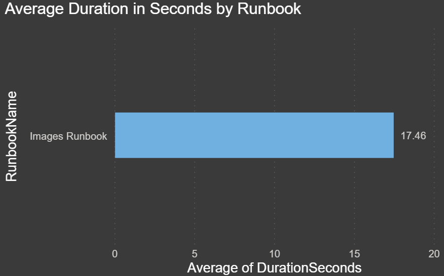 Average Duration in Seconds by Runbook: The chart below shows the number of times each runbook has been executed. This chart is also filtered by IsPublished true: