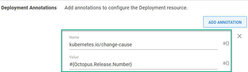 In the Deploy Kubernetes Containers step, go to Deployment Annotations and add an annotation type of kubernetes.io/change-cause with the value of #{Octopus.Release.Number}
