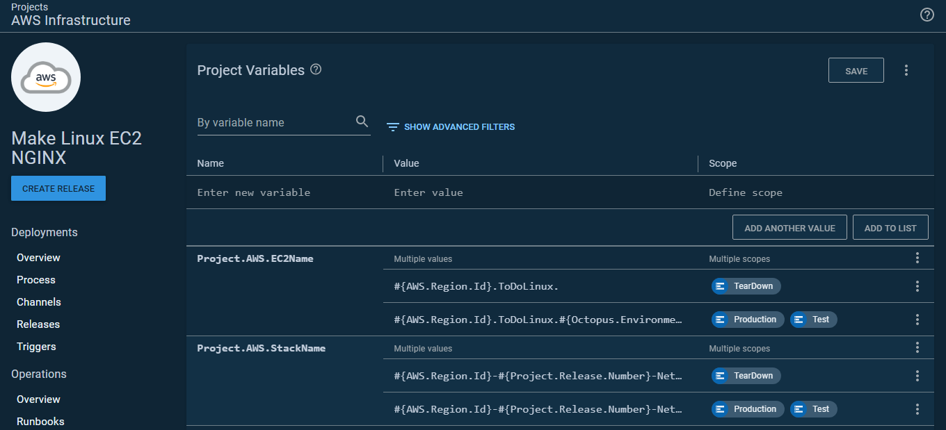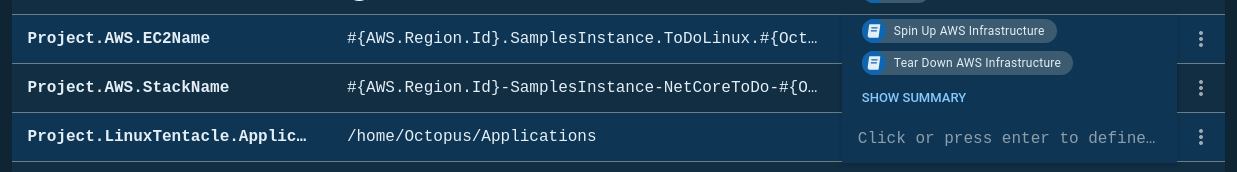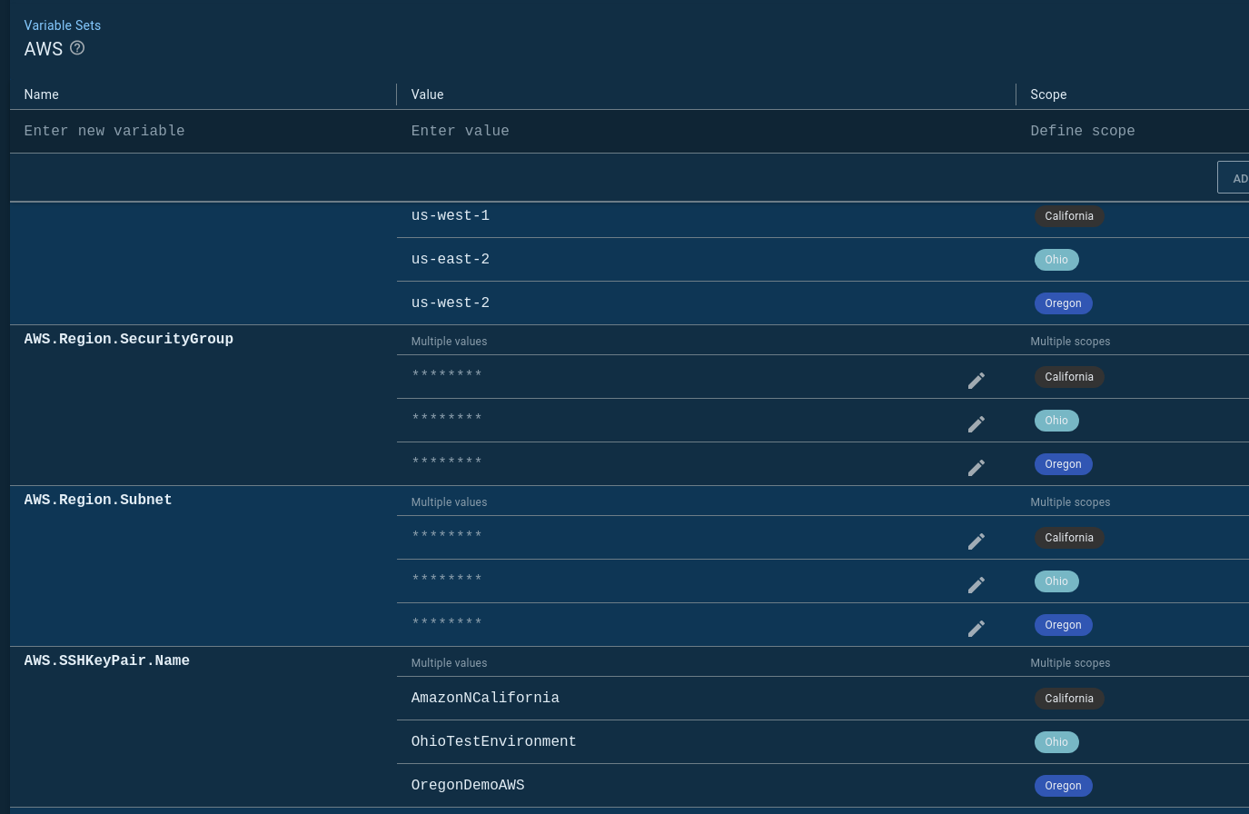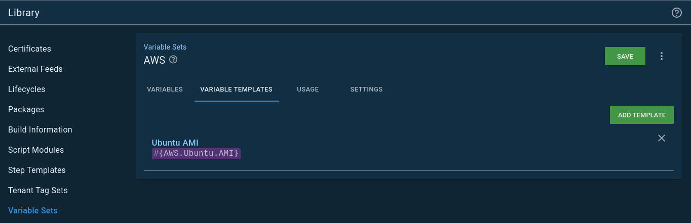 I created a variable set called AWS, that I populated with variables I need for my CloudFormation template: