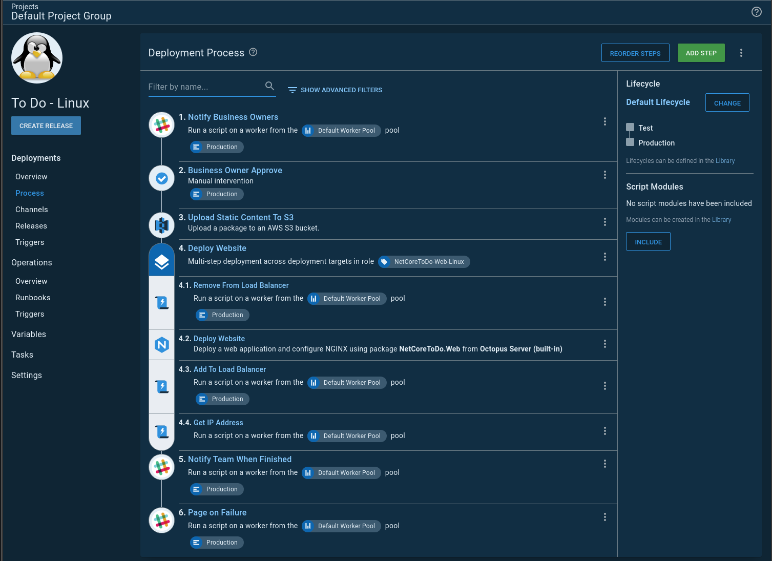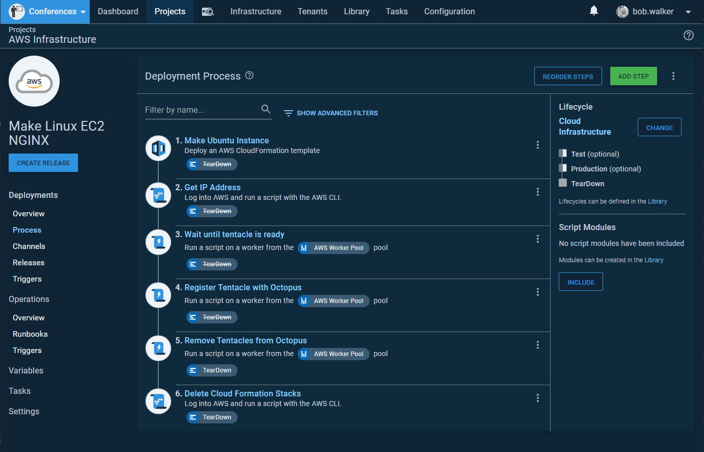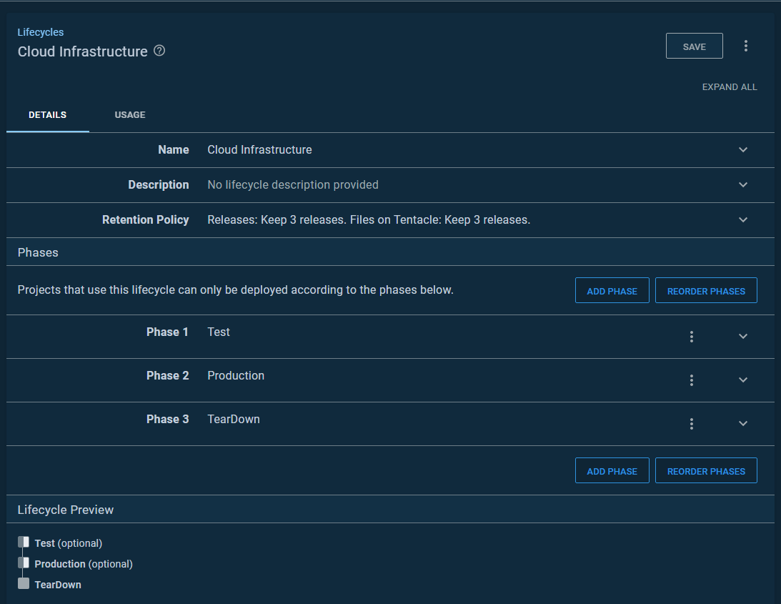 This approach led to some quirks. The first being, I had to create a lifecycle because I was using a deployment process, and deployment processes have lifecycles. In this example, I have two environments, Test and Production. However, I needed an environment to tear every thing down. Which led to my second quirk. I needed another environment called Teardown.