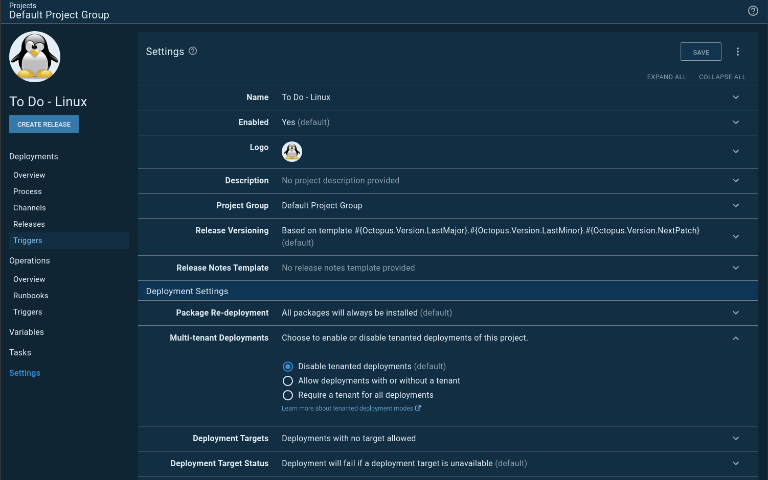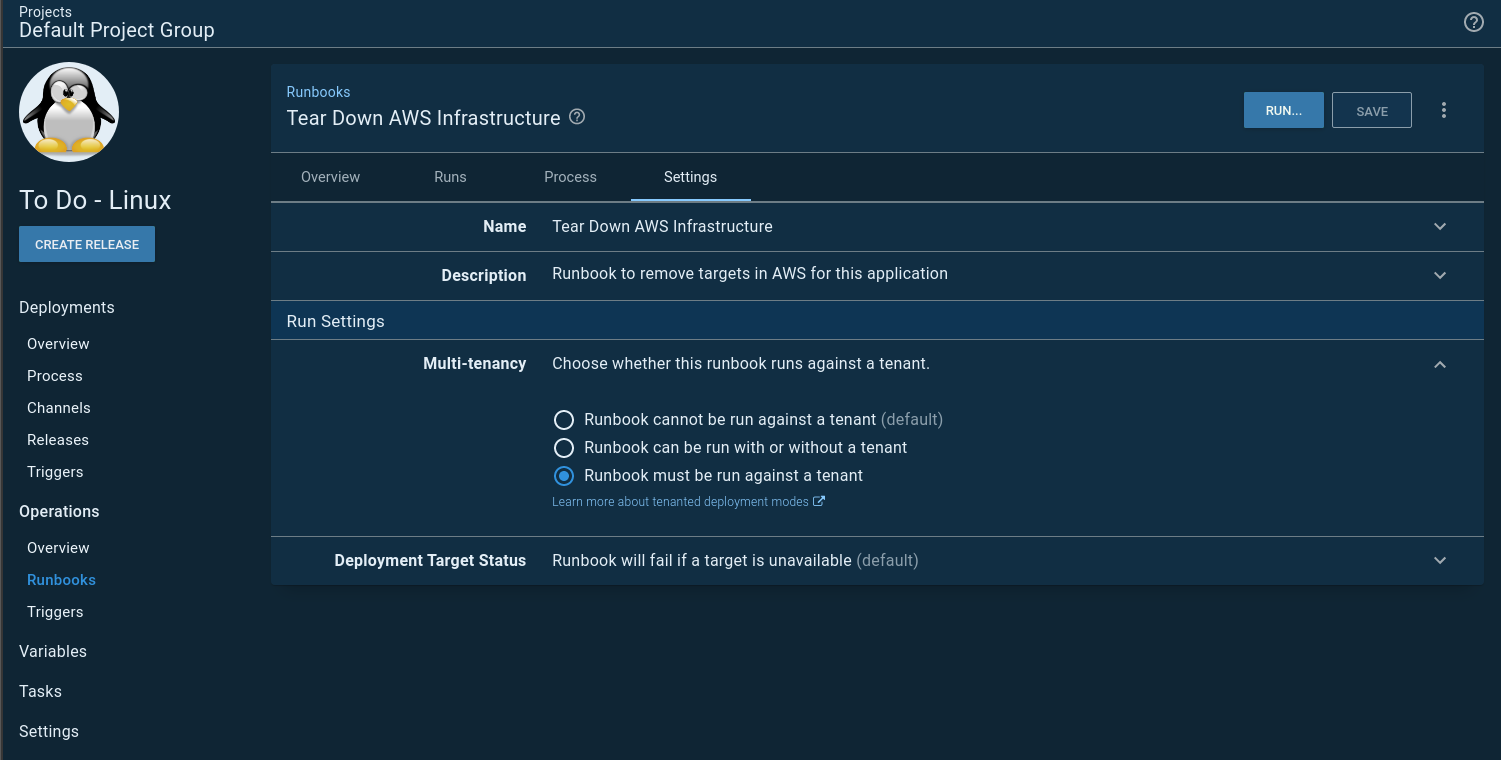 This is when I found out it’s possible for a project to not allow tenanted deployments, BUT a runbook can require them. In my project settings, I set it to disable tenanted deployments: