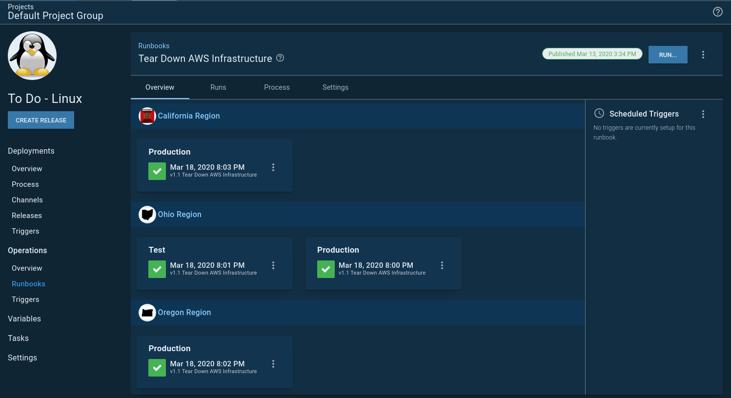 Before runbooks, my Infrastructure as Code process was a normal deployment process, even though I wasn’t deploying anything, but instead, running scripts against a cloud provider. My goal for my process was simple; have a single project to tear up and down my infrastructure.
