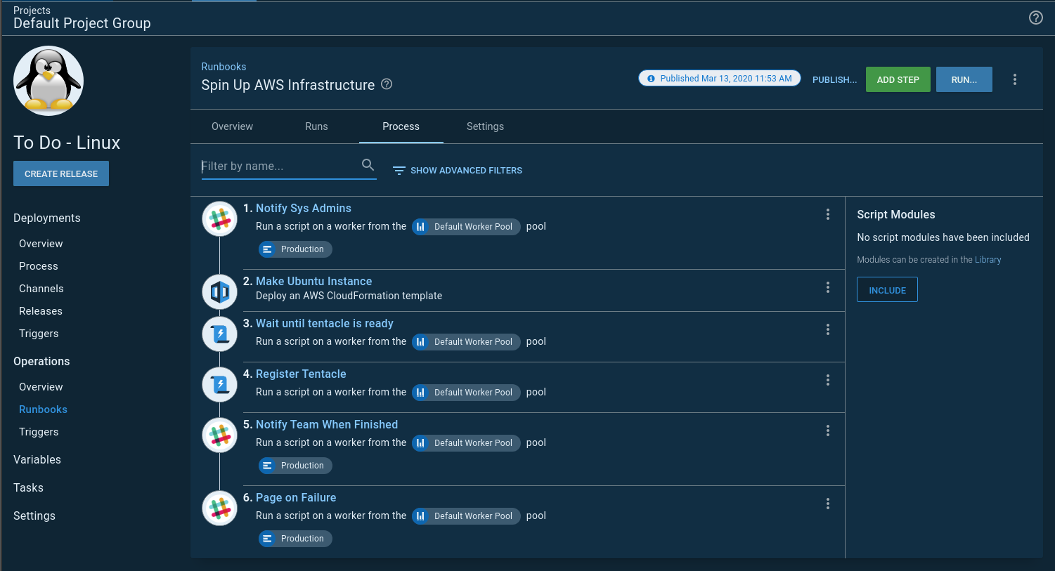 In preparation for the Octopus 2020.1 release webinar, I needed to spin up and down the infrastructure for my demos. Before runbooks, I had a separate Infrastructure as Code project to handle this. I didn’t want to do that again, and Operations Runbooks was built with this scenario in mind. The webinar prep allowed me to port my process over to a runbook, and it gave me an opportunity to adjust how I approach Infrastructure as Code in Octopus Deploy.