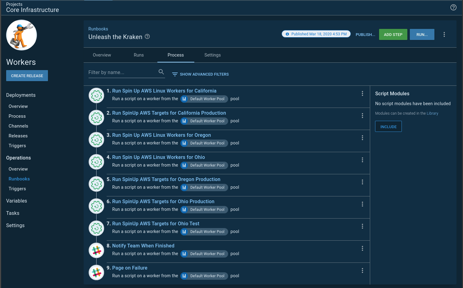 There is no built-in step for one runbooks to start another runbook, so I wrote this step template. Now I can have a runbook spin up and down my infrastructure in an orderly fashion. I called that runbook Unleash the Kraken: